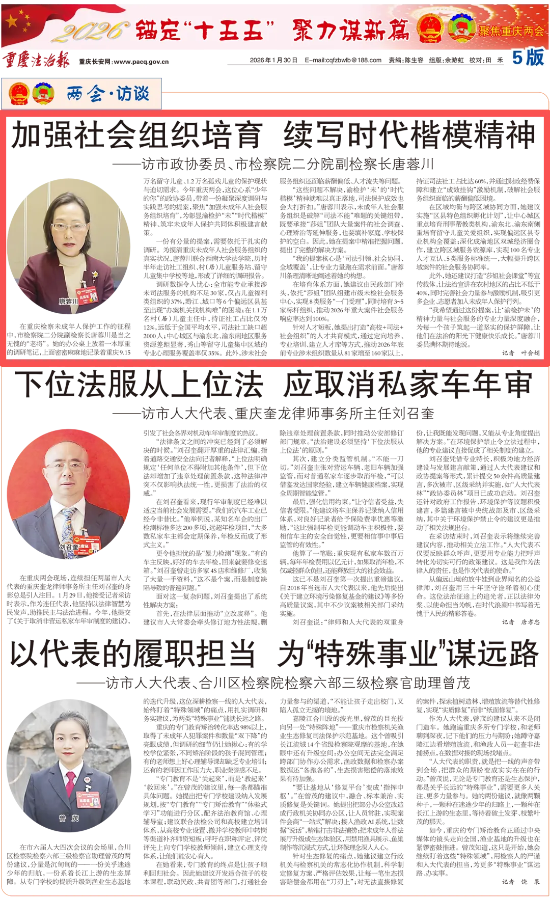 “我希望通过这份提案,让‘渝检护未’的精神力量与社会服务的专业力量深度融合,为每一个孩子筑起一道坚实的保护屏障,让他们在法治的阳光下健康快乐成长。”唐蓉川委员满怀期待地说。