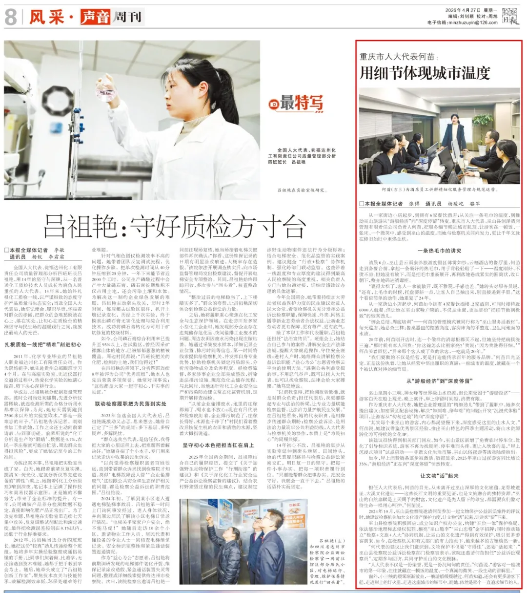 2026年4月27日,《检察日报》第8版刊登《重庆市人大代表何苗:用细节体现城市温度》一文,内容如下: