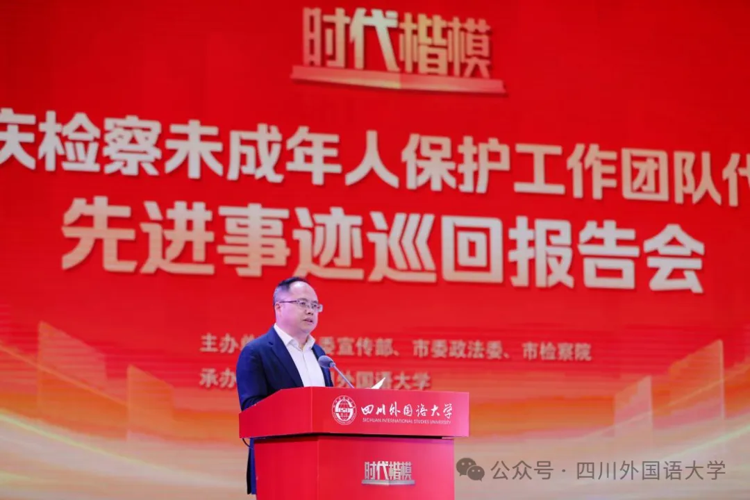 未成年人保护工作团队代表走进该校歌乐大礼堂举办专场先进事迹报告会。四川外国语大学党委书记刘嗣方与渝检护“未”团队代表一行进行了会前交流,副校长严功军出席先进事迹报告会并致辞。