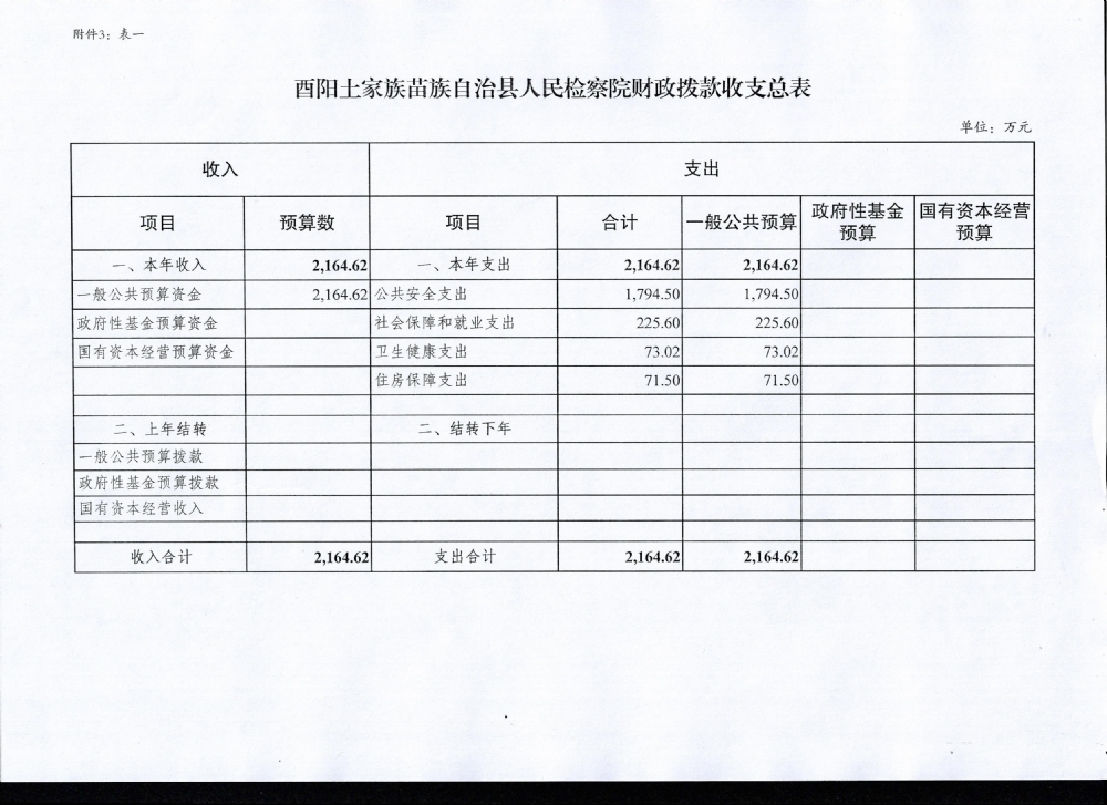 一、单位基本情况 (一)职能职责 酉阳土家族苗族自治县52AV 是国家法律监督机关,依照法律规定在辖区范围内对有关刑事案件行使侦查权;对刑事案件进行审查,批准或者决定是否逮捕犯罪嫌疑人;对刑事案件进行审查,对决定提起公诉的案件支持公诉;依照法律规定提起公益诉讼;对诉讼活动实行法律监督;对判决、裁定等生效法律文书的执行工作实行法律监督;对看守所的执法活动实行法律监督;法律规定的其他职权。 (二)单位构成 本单位设置了检察一部、检察二部、检察三部、检察四部、检察五部、检察六部、政治部、办公室及龙潭检察室。 二、部门收支总体情况 (一)收入预算:2022年年初预算数2164.62万元,其中:一般公共预算拨款2164.62万元,政府性基金预算拨款0万元,国有资本经营预算收入0万元,事业收入0万元,事业单位经营收入0万元,其他收入0万元;收入较去年增加161.62万元,主要是一般公共预算拨款增加161.62万元。 (二)支出预算:2022年年初预算数2164.62万元,其中:一般公共安全支出支出1794.50万元,教育支出0万元,社会保障和就业支出225.60万元,卫生健康支出73.02万元,住房保障支出71.50万元;支出较去年增加161.62万元,主要是基本支出增加95.66万元,项目支出增加65.96万元。 三、部门预算情况说明 2022年一般公共预算财政拨款收入2164.62万元,一般公共预算财政拨款支出2164.62万元,比上年增加161.62万元,其中:基本支出1730.66万元,比上年增加95.66元,主要原因是人员增加及政策性增资,主要用于保障在职人员工资福利及社会保险缴费,退休人员补助等,保障部门正常运转的各项商品服务支出;项目支出433.96万元,比上年增加65.96万元,主要原因是新建智慧案管大厅,主要用于提升检察案管大厅信息化水平,提高接访质量。 酉阳土家族苗族自治县52AV 2022年未使用政府性基金预算拨款安排的支出,与上年保持一致。 四、“三公”经费情况说明 2022年“三公”经费预算51万元,比上年减少12万元,其中:因公出国(境)费用0万元,比上年增加0万元,主要原因是2022年未安排因公出境事宜;公务接待费3万元,比上年减少12万元,主要原因是落实中央过紧日子要求,严格规范控制公务接待费;公务用车运行维护费48万元,比上年增加0万元,主要原因是2022年未新增公务用车,公务用车运行维护费保持不变;公务用车购置0万元,比上年增加0万元,主要原因是2022年,机关公务车仍在使用年限内,无新购车辆安排。 五、其他重要事项的情况说明 1.机关运行经费。2022年一般公共预算财政拨款运行经费475.81万元,比上年增加19.31万元,主要原因为单位在编人员变动。主要用于办公费、印刷费、邮电费、物管费、差旅费、会议费、培训费及其他商品和服务支出等。 2.政府采购情况。所属各预算单位政府采购预算总额0万元,其中:政府采购货物预算0万元,政府采购工程预算0万元,政府采购服务预算0万元。一般公共预算拨款政府采购0万元,其中:政府采购货物预算0万元,政府采购工程预算0万元,政府采购服务预算0万元。 3.绩效目标设置情况。2022年项目支出均实行了绩效目标管理,涉及一般公共预算当年财政拨款433.96万元。 4.国有资产占有使用情况。截止2021年12月,所属各预算单位共有车辆12辆,其中一般公务用车0辆、执勤执法用车12辆,2022年一般公共预算安排购置车辆0辆,其中一般公务用车0辆,执法执勤用车0辆。 六、专业性名词解释 (一)财政拨款收入:指本年度从本级财政部门取得的财政拨款,包括一般公共预算财政拨款和政府性基金预算财政拨款。 (二)其他收入:指单位取得的除“财政拨款收入”、“事业收入”、“经营收入”等以外的收入。 (三)基本支出:指为保障机构正常运转、完成日常工作任务而发生的人员经费和公用经费。 (四)项目支出:指在基本支出之外为完成特定行政任务和事业发展目标所发生的支出。 (五)“三公”经费:指用一般公共预算财政拨款安排的因公出国(境)费、公务用车购置及运行维护费、公务接待费。其中,因公出国(境)费反映单位公务出国(境)的国际旅费、国外城市间交通费、住宿费、伙食费、培训费、公杂费等支出;公务用车购置费反映单位公务用车购置支出(含车辆购置税);公务用车运行维护费反映单位按规定保留的公务用车燃料费、维修费、过路过桥费、保险费、安全奖励费用等支出;公务接待费反映单位按规定开支的各类公务接待(含外宾接待)支出。 单位预算公开联系人:张浥通 联系方式:023-75532685